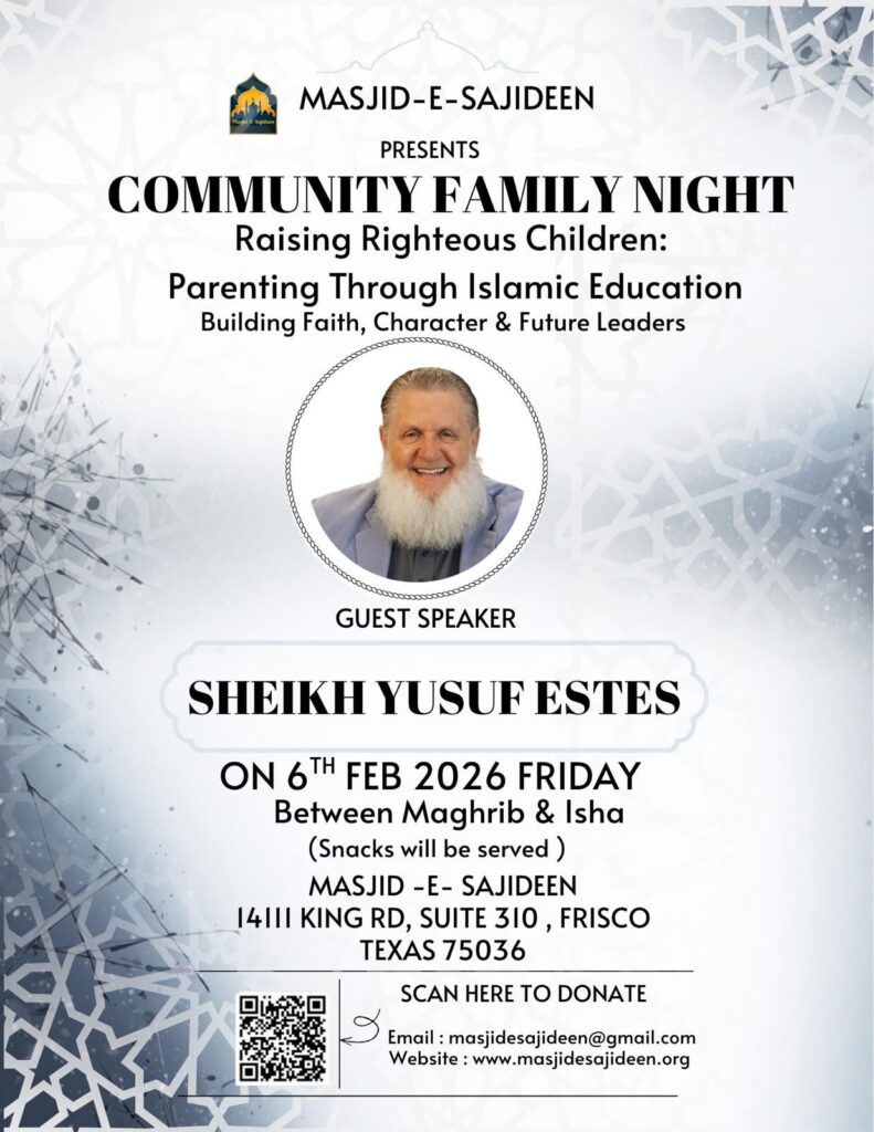 Masjid-e-Sajideen is honored to host a Community Family Night with Sheikh Yusuf Estes on Friday, Feb 6, 2026, between Maghrib & Isha, at Masjid-e-Sajideen, 14111 Suite 310, Frisco, TX 75036.